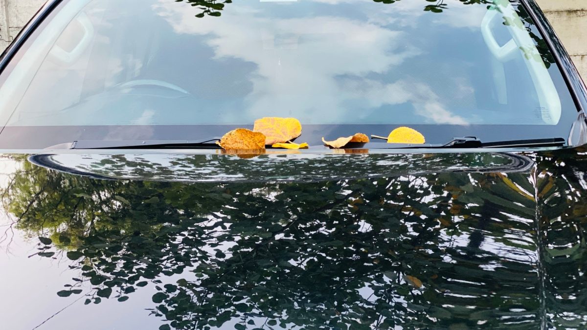 Dry yellow leaf fallen on front screen of vehicle. Reflection of sky and plant are also seen on bonnet of vehicle.